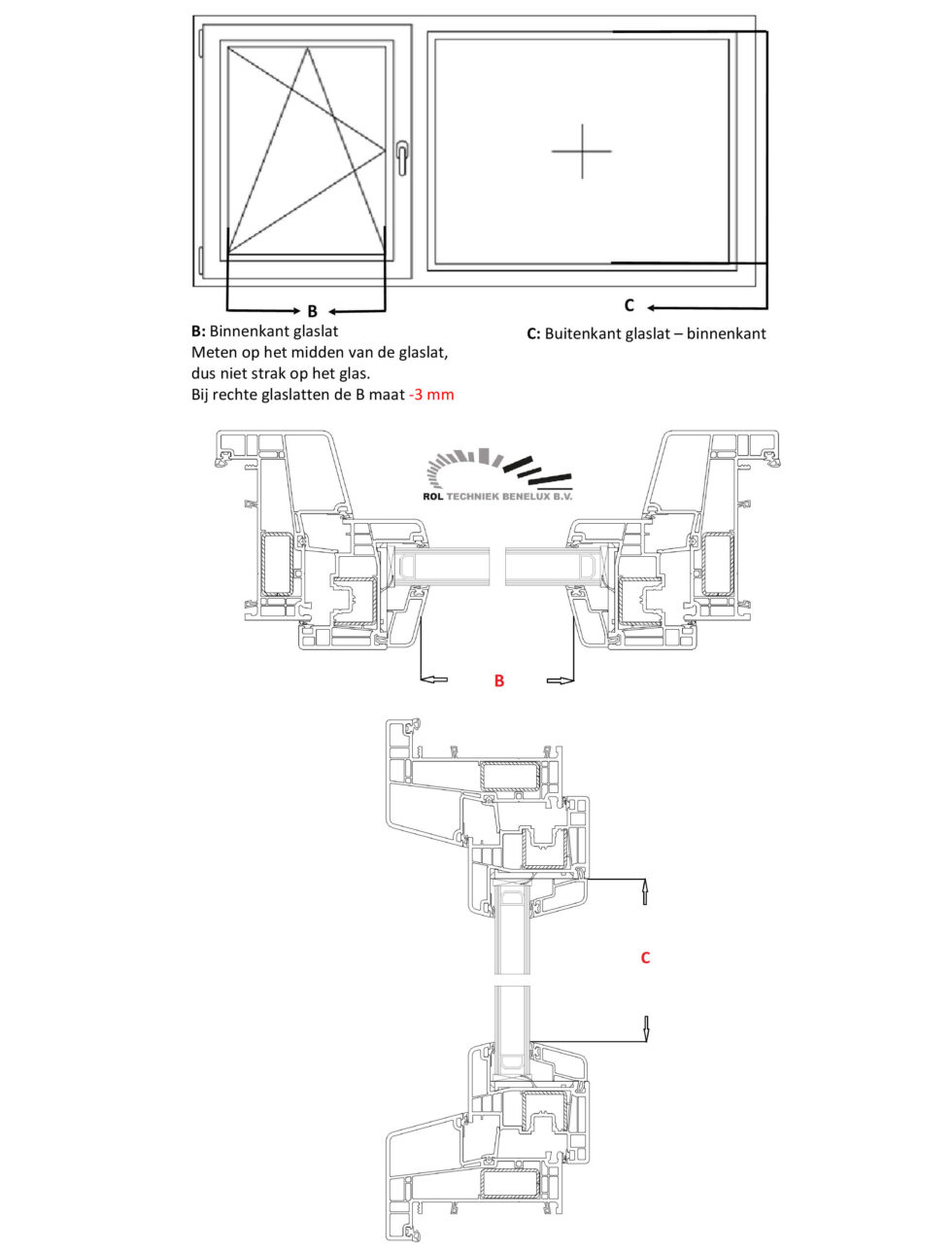 B: De meting in de breedte van het raam exclusief de glaslat.
